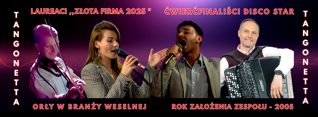 - Zespół muzyczny na wesela i bankiety Tangonetta - to formacja muzyków po Akademiach Muzycznych. Artyści są laureatami wielu konkursów instrumentalnych jak i wokalnych. Każdy z muzyków jest indywidualnością, którzy mają bogate doświadczenie sceniczne i grali u boku takich gwiazd jak: Ewa Bem, Zbigniew Zamachowski czy Piotr Rubik (więcej o muzykach w menu muzycy).